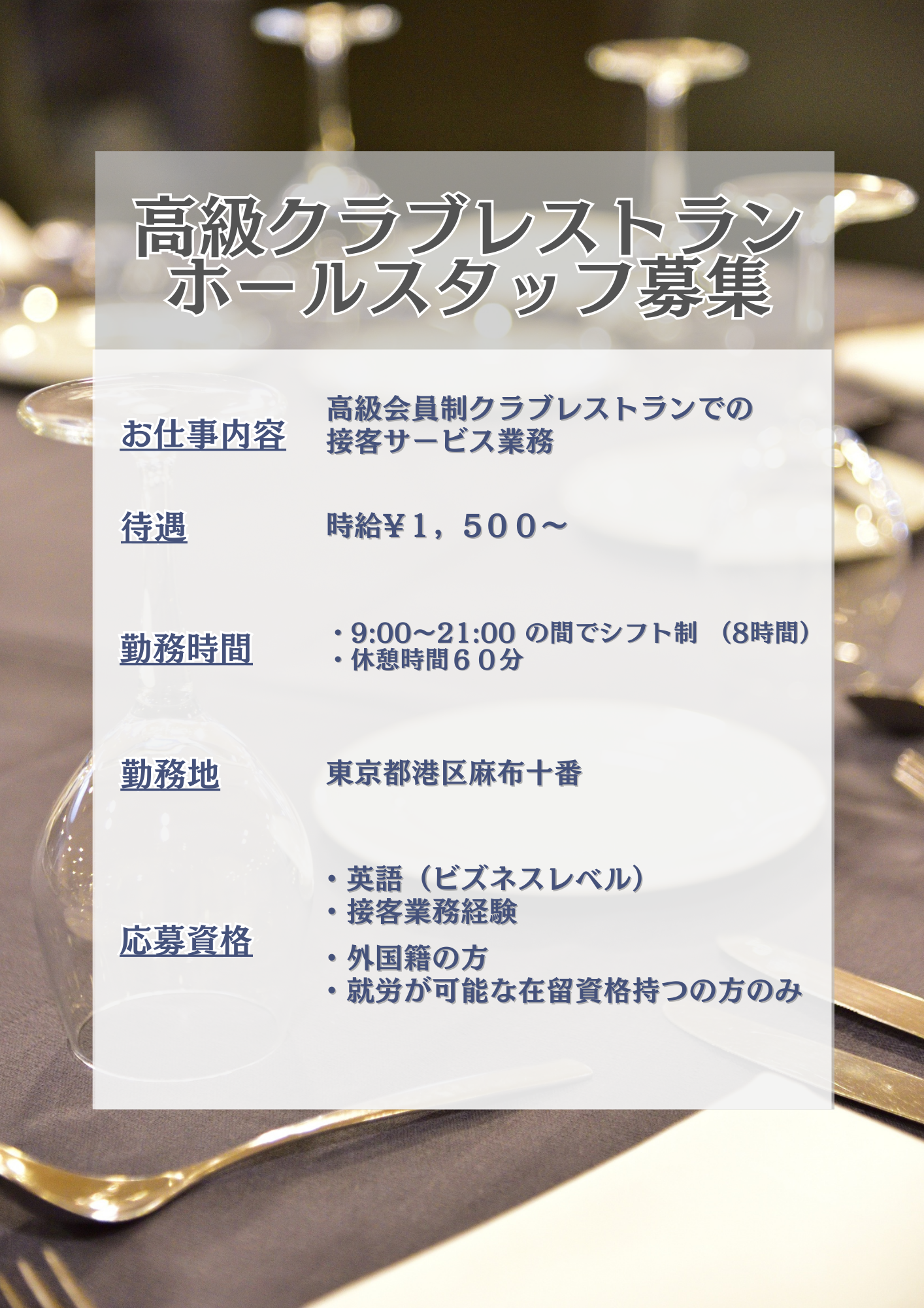 - Restaurant Chuo-ku Salary: JPY 1,500 / par heure
