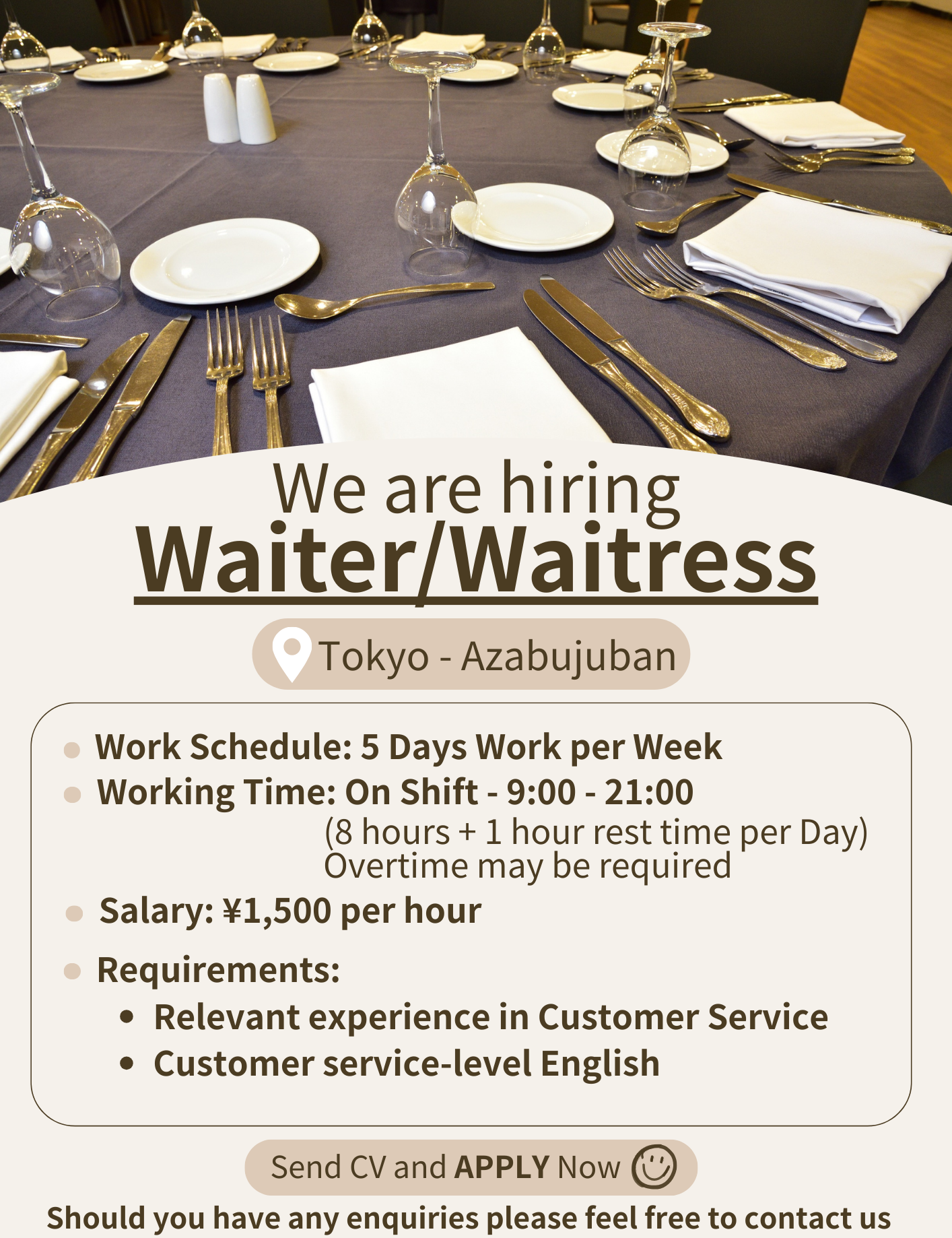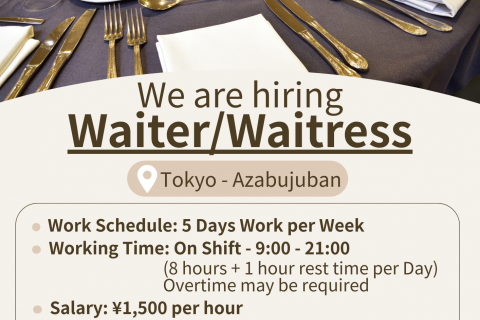 - Restaurant Chiyoda-ku Salary: JPY 1,600 - JPY 1,800 / par heure