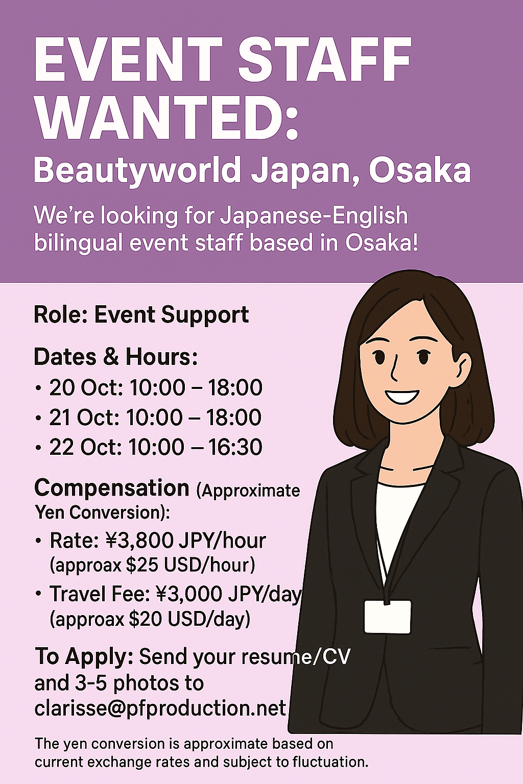 - Event Staff Osaka-shi Salary: JPY 1,400 / theo giờ